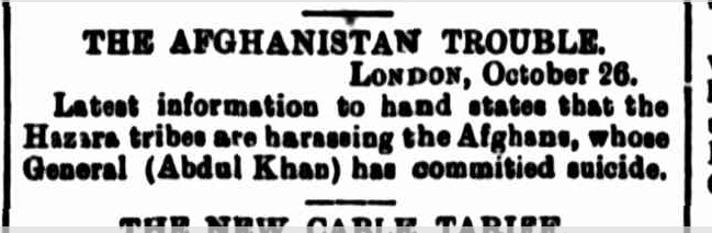 THE AFGHANISTAN TROUBLE. LONDON, October 26. Latest information to hand states that the Hazara tribes are harassing the Afghans, whose General (Abdul Khan) has commitied (committed) suicide. Related ◉ Afghan Affairs (The Mercury 1892) ◉ Afghanistan. The Hazara Rebellion (Evening News) ◉ Affairs in Afghanistan (Leader 1892) Source Queensland Times, Ipswich Herald and General Advertiser (Qld. : 1861 – 1908), Thu 27 Oct 1892, Page 5, THE AFGHANISTAN TROUBLE About this file Added: October 21, 2020 Last updated: 2 years ago Share this file